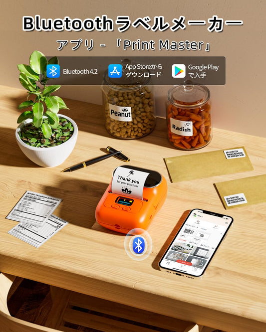 ラベルプリンター Pesuza M110 スマホ PC対応 宛名ラベルプリンター ラベルライター シールプリンター スマホプリンター バーコードプリンター qrコードプリンター サーマルラベルメーカー 充電式 ビジネス用 Bluetooth接続 宛先 領収書 食品表示 値札 アドレス DIY 幅20mmから50mmまで 黒文字 AndroidとIOS適応 連続印刷 オレンジ 40x30感熱紙付き